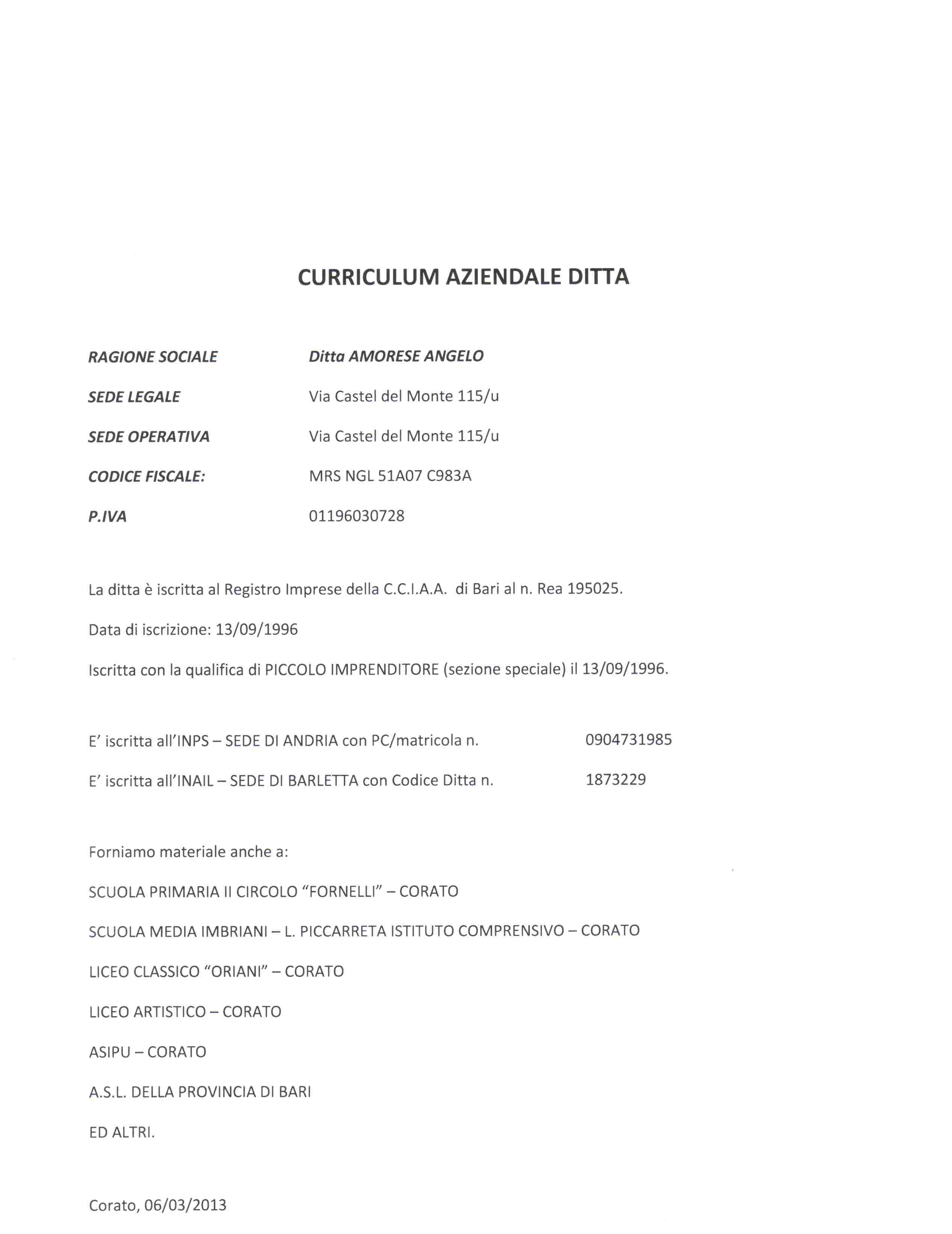 Ufficio: Settore IV - Lavori Pubblici Responsabile: Ing. Gaetano Pierro      Beneficiario: AMORESE ANGELO      Dati Fiscali:P.I.02589350723 Oggetto: FORNITURA MATERIALE DI FERRAMENTA Norma/Titolo Attribuzione: DETERMINA 111/2016 Modalità Individuazione: ART.125 COMMA 11 D.LGS 163/2006 Importo: 1.983,00 € Data Inserimento: 09-06-2016